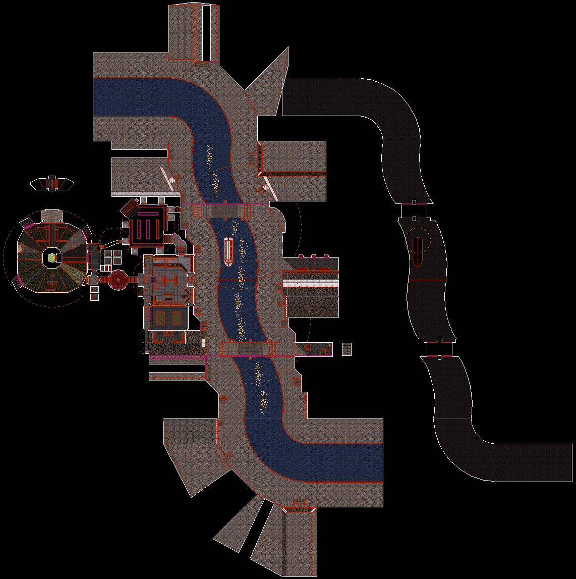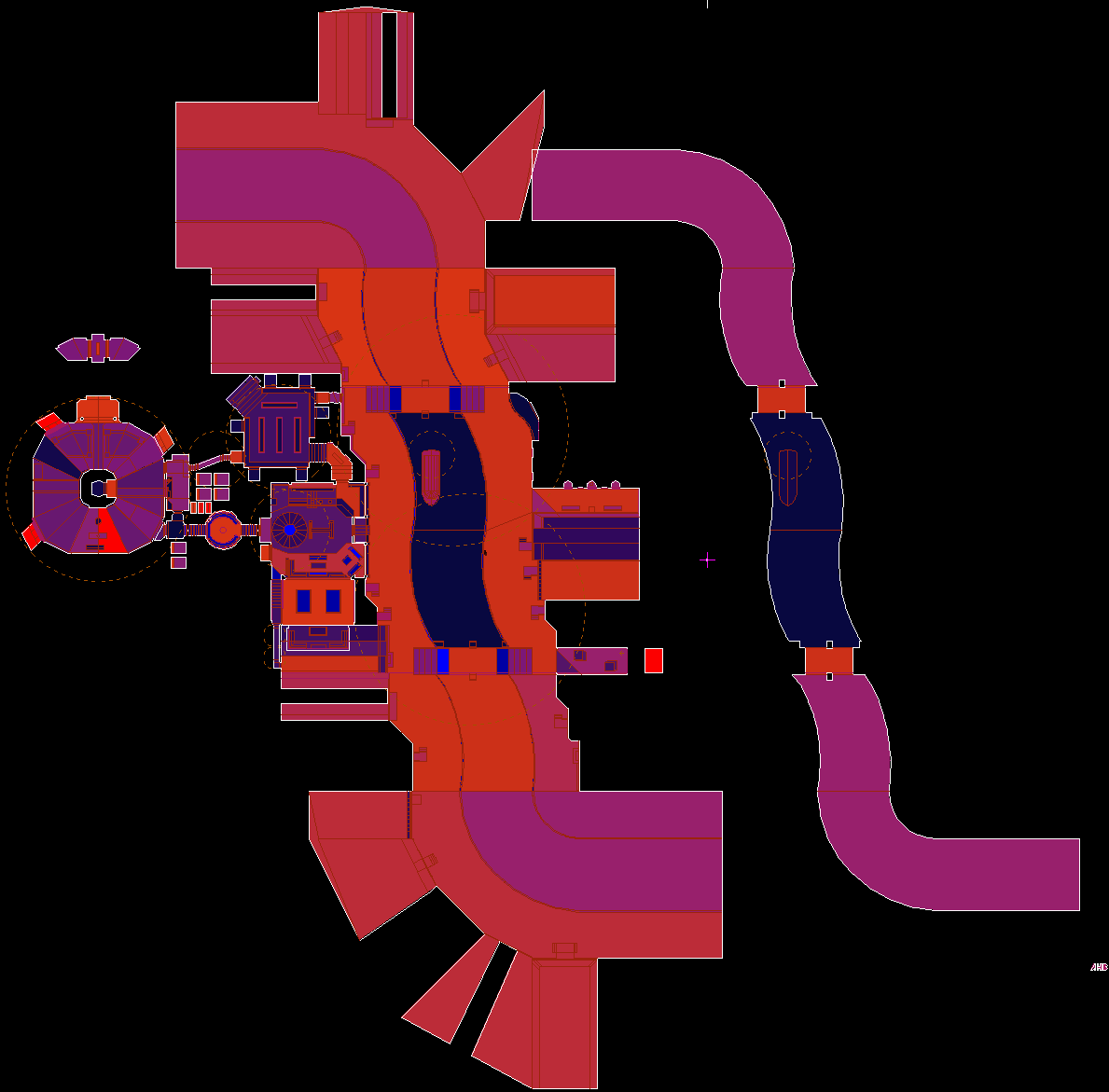 Sector chronology in World Tour. Bright blue=oldest; bright red=newest. Oldest sectors in ascending order include: railings of bridge across from start position (sector 0), part of hall after emerging from cannabis smoke room, first sector of non-Euclidean courtyard.
