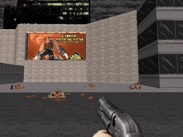 - A poster titled "Lunar Apocalypse starring Duke Nukem" can be seen on this level, and the movie studio appears to be filming a movie based on Duke's exploits in outer space.