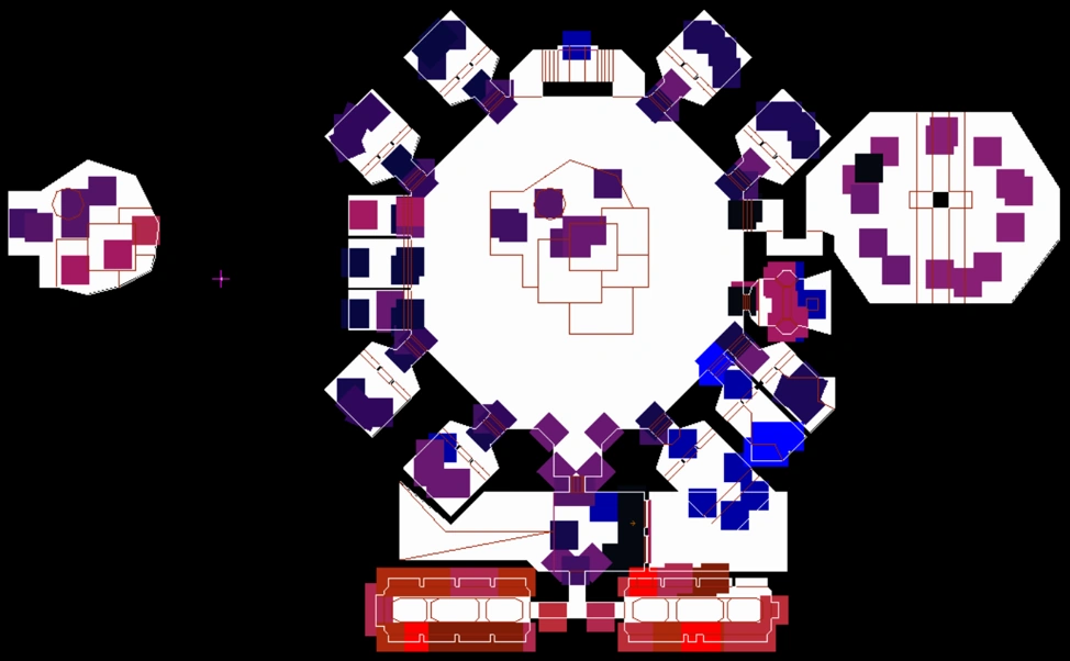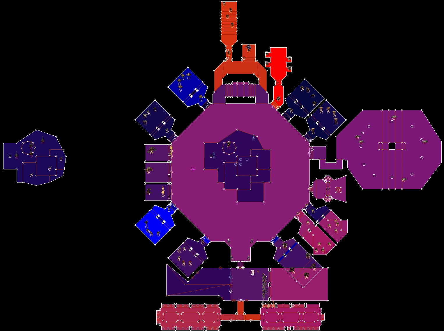 In the figures above, all the sectors have been recolored with white floor textures, and the colored blocks correspond to individual sprites, such that the lowest-numbered sprites are bright blue and the highest-numbered sprites are bright red. Notice how most of the newly added sprites near the bottom of the map are red, whereas many of those near the top are blue. This contradicts the underlying assumption that newly added sprites should have higher indices.