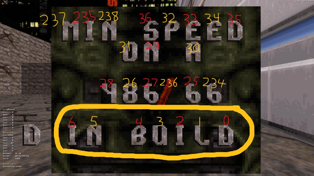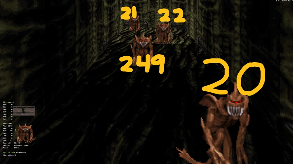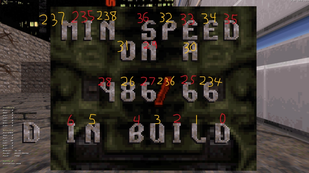 For any 1994-1996 map, the best rule-of-thumb is that sprites with very high indices and sprites with very low indices are both probably newer. This does not make sprite chronology completely useless for older maps – because sprite indices cluster along two dissociable lines, it might be possible to “guess” which method was used to create each sprite and reconstruct a clearer chronology – but this does mean that sprite chronology is much harder to interpret for older maps and, for that reason, less useful than sector chronology.